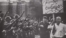 The Newsreel, most frequently called Newsreel, was an American filmmaking collective founded in New York City in late 1967. In keeping with the radical student/youth, antiwar and Black power movements of the time, the group explicitly described its purpose as using "films and other propaganda in aiding the revolutionary movement." The organization quickly established other chapters in San Francisco, Boston, Washington, DC, Atlanta, Detroit, Chicago, Los Angeles, Washington, DC and Puerto Rico, and soon claimed "150 full time activists in its 9 regional offices." Co-founder Robert Kramer called for "films that unnerve, that shake people's assumptions…[that] explode like grenades in people’s faces, or open minds like a good can opener."[1] Their film's production logo was a flashing graphic of The Newsreel moving in and out violently in cadence with the staccato sounds of a machine gun. A contemporary issue of Film Quarterly described it as "the cinematic equivalent of Leroi Jones's line 'I want poems that can shoot bullets.'"[2]: p.18 The films produced by Newsreel soon became regular viewing at leftwing political gatherings during the late 1960s and early 1970s, seen in parks, church basements, on the walls of buildings, in union halls, even at Woodstock."[2]: p.10 This history has been largely ignored by film and academic historians causing the academic Nathan Rosenberger to remark: "it is curious that Newsreel only occasionally shows up in historical studies of the decade."[3]: p.1 [4]: 70 [5][6]