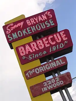 Sonny Bryan's Smokehouse is a well-known BBQ restaurant in Dallas, Texas that was founded by William Jennings Bryan Jr. (known as Sonny) in 1958 near the University of Texas Southwestern Medical Center.[1][2] It has seven locations in the Dallas – Fort Worth Metroplex (DFW) while closing all franchise units in Utah by mid-2014. Sonny Bryan's also has one of the largest catering companies in DFW.