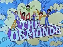 The Osmonds is a 1972 ABC-TV Saturday morning cartoon series produced by Rankin/Bass Productions starring the Osmond Brothers.[1] Each episode features the family in a different location around the world, with young Jimmy's antics usually driving the plot of the episode. As with most television series oriented around bands, the Osmonds' songs were featured prominently in the series. The series also featured their talking pet dog, Fuji.[2] Marie Osmond did not appear in the series (save for being briefly depicted in "Transylvania,") as she would not make her performing debut until 1973. An abridged version of their hit song "One Bad Apple" was used for the opening and closing credits of the show.