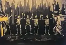 Along with the lavish costumes and scenery, another main focus of the film is the spectacular special effects.[5] Méliès's techniques for creating these effects included stage machinery, pyrotechnics, substitution splices, superimpositions, and dissolves.[7] The transparency effect of phantom skeletons was created through multiple exposure, with the images of the fighting protagonists and the ghostly skeletons recorded over each other so that both would be visible.[12] Méliès's catalogue description for the film shows particular pride in the scene in which an apparently impenetrable forest, painted on flats arranged to show depth of space, magically parts to reveal a temple: "This decoration which was made only after considerable labor is a veritable marvel of achievement. It possesses a great artistic beauty."[2]