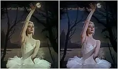 A main point of contention amongst both British and American critics was a perceived lack of realism concerning the ballet sequences.[58] The focus of this criticism was the film's central 17-minute ballet performance of The Ballet of the Red Shoes: Many dance critics felt the sequence's impressionistic touches—which include abstract hallucinations and visual manifestations of Vicky's mental state—detracted from the physical aspects of the ballet.[59] British ballet critic Katherine Sorley Walker also dismissed the sequence, commenting that it marked "a departure from the illusion of stage ballet to the limitless and lush spaces reflecting the ballerina's thought."[56] Eames made similar criticism, condemning the subjective elements of the sequence as "corrupting the integrity of the ballet," as well as the choreography.[60] Philip K. Scheuer of the Los Angeles Times, however, praised the presentation of ballet in the film, deeming it "the most ambitious—and probably the most dazzlingly successful—use of traditional-type ballet in any motion picture to date."[61]