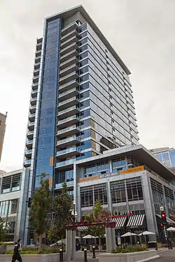 The residential skyscraper has 20 floors of 150-residential units above 3 floors of mixed use office and retail space, the 3rd floor includes a pool, fitness centers and entertainment rooms.[3] The modernist style of the build, tinted blue glass and balconies on every residential floor makes it one of the more desirable residential skyscrapers in Salt Lake City and in Utah,. The 23 storey building also has a controlled underground parking lot, for all residents and workers.[1]