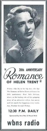 - ↑ Wolters, Larry (July 19, 1953). "Helen Trent's Romance Now 20 Years Old". Chicago Tribune. Retrieved 28 June 2023.
