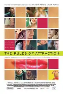 The Rules of Attraction is a 2002 black comedy-drama film written and directed by Roger Avary and based on Bret Easton Ellis's 1987 novel of the same title. The film was distributed by Lions Gate Films. The story follows three Camden College students who become entangled in a love triangle; a drug dealer, a virgin, and a bisexual classmate. It stars James Van Der Beek, Shannyn Sossamon, Ian Somerhalder, Jessica Biel, Kate Bosworth, Kip Pardue, and Joel Michaely.