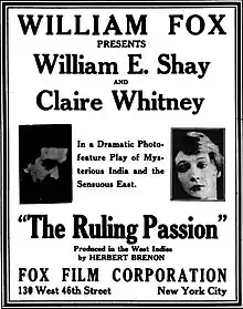 The Ruling Passion is a 1916 American silent drama film directed by James C. McKay and starring William E. Shay, Claire Whitney and Florence Deshon.[1] Produced by Fox Film, like several of the studio's productions at the time it was shot in Kingston, Jamaica. It is now considered a lost film.