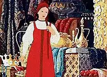 The Scarlet Flower (Russian: Аленький цветочек, Alenkiy tsvetochek) is a 1952 Soviet feature animated film directed by Lev Atamanov. It was produced at the Soyuzmultfilm studio in Moscow and is based on the story of the same name by Sergei Aksakov. Nastenka's song "During this time in a darling party"/"В эту пору в родимой сторонушке" was sung by the famous chamber singer Victoria Ivanova.