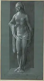 Her face bears elements of idealisation, although for the most part she is presented as a real woman. Her expression, near identical to the 1508 drawing, is difficult to interpret, as it contains none of the passivity, chastity, or sly sidelong glances usually associated with contemporary depictions of her.[5] She is given a monumental and statuesque pose, but without the sense of pagan sensuality present in his 1507 Adam and Eve in the Prado, Madrid.[6] Critics have remarked unfavourably on her sour expression, unnaturally elongated and disproportional figure, and uncomfortable contrapposto pose.[7] The painting has been described as one of Dürer's most unpopular works, with many art historians, including Max Friedländer and Erwin Panofsky, commenting unfavourably on apparent qualities such as "austerity and awkwardness".[8][9] Art historian Fedja Anzelewsky described her as "a parody rather than an exaltation of the classical feminine figure."[10]