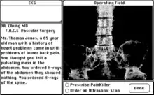 In The Surgeon, the player takes the role of a surgeon in a hospital. The game begins with the player meeting with a patient, and being provided with either an X-ray of the spine or an ultrasound examination of the abdomen, both of which may need to be requested by the player for further insight rather than being given to begin with.[1] When meeting with a patient, the player may judge the patient's condition from a description of symptoms from the patient and the information they're given, and the player may choose to observe the patient (do nothing), prescribe painkillers, or operate. Inaction, such as prescribing painkillers or doing nothing if a patient's condition is serious and time-sensitive, may result in the patient's death.[1] Patients may also die from failed surgery, or abrupt complications during surgery if the player fails to treat them in time.[1] Patients may also die post-surgery from infection if the player neglects to sterilize the area with antiseptic solution before and after surgery, or by not washing their hands.[2][3]