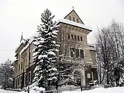 The museum was established by the Tatra Museum Society, and the building which today serves as the main branch, located in the centre of Zakopane, at 10 Krupówki Street, was designed specifically for this purpose by Stanisław Witkiewicz and Franciszek Mączyński. The building is an example of a "brick-and-stone" variety of Zakopane style architecture.[1] The design was prepared in 1913, and the building started between 1913 and 1914. Count Władysław Zamoyski, a member of the Tatra Museum Society, donated the stones used for building. After the first world war, which had slowed the completion of building, the remaining works and preparations of exhibitions were possible thanks to a loan from Maria Skłodowska-Curie.[1]