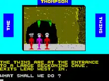 The gameplay of The Thompson Twins Adventure falls within the early graphical adventure idiom. The player is presented with a simple graphical scene with a text caption below describing important features of the scene and prominent manipulable items. Below the text caption is the parser line through which the player can type commands to the player characters. Typical typed commands follow a simple VERB-NOUN format[10] such as "take jar" or "read newspaper".[2][5] To move from one scene to the next, a player must type a directional command such as "North", "Down", or "Out".[2][5] The player characters will follow the typed instructions and a new scene will take the place of the former scene. Further specialized commands follow conventions previously established in non-graphical text adventures. Thus the "look" command repeats back to the player the original description of the scene, and the "inv" command can be used to gain information on the player characters' inventory.[2] Compass directions in the game are not always intuitive and the graphical depictions are not always accurate so gameplay often involves the creation of a game map on paper.[10]