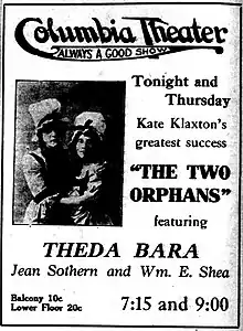 The Two Orphans was a 1915 American silent romantic drama film directed by Herbert Brenon and starring Theda Bara. This film was based on the 1872 French play Les deux orphelines, by Adolphe D'Ennery and Eugene Cormon[1] which was translated into English by N. Hart Jackson.[2] It was the play that was being performed at the time the Brooklyn Theater Fire broke out.[3] The film was made by Fox Film Corporation and was partially shot on location in Québec, Canada.[4] It is now considered to be lost.[1]