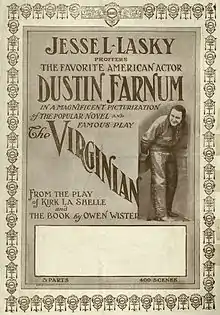 The Virginian is a 1914 American silent Western film based on the 1902 novel The Virginian by Owen Wister. The film was adapted from the successful 1903โ04 theatre play The Virginian, on which Wister had collaborated with playwright Kirke La Shelle. The Virginian starred Dustin Farnum in the title role, a role he reprised from the original play. It was directed by Cecil B. DeMille.