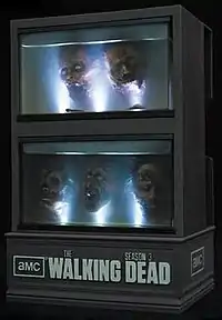The third season was also released in limited edition Blu-ray packaging, a replica of The Governor's walker head aquarium as seen in season three. The limited edition packaging was designed by Greg Nicotero and sculpted by McFarlane Toys.[45]