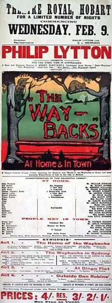 The Waybacks, also known as The Waybacks at Home and in Town, was a 1915 Australian play by Philip Lytton which was adapted from the stories by Henry Fletcher about the comic adventures of a rural family. The play was seen as attempt to cash in on the success of the theatre version of On Our Selection, and enjoyed almost as much popularity at the box office during its original run.[4][5]