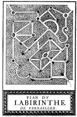 The labyrinth of Versailles was a hedge maze in the Gardens of Versailles with groups of fountains and sculptures depicting Aesop's fables. André Le Nôtre initially planned a maze of unadorned paths in 1665, but in 1669, Charles Perrault advised Louis XIV to include thirty-nine fountains, each representing one of the fables of Aesop. The work was carried out between 1672 and 1677. Water jets spurting from the animals mouths were conceived to give the impression of speech between the creatures. There was a plaque with a caption and a quatrain written by the poet Isaac de Benserade next to each fountain.[1] A detailed description of the labyrinth, its fables and sculptures is given in Perrault's Labyrinte de Versailles, illustrated with engravings by Sébastien Leclerc.