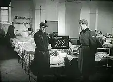 Filming took place over eleven days between 16 August and 11 September 1944.[13] The assistant directors were František Zelenka, Jo Spier, and Hans Hofer.[17][18][19] Karel Pečený and his company Aktualita provided the cameramen, and halfway through filming, Pečený effectively took over as director.[20] The two cameramen were Ivan Frič and Čeněk Zahradníček, assisted by Benda Rosenwein. The film's soundtrack has been credited to Jaroslav Sechura and Josef Francek.[19] Aktualita collaborated with the German newsreel company Favoritfilm in producing the film.[15] Prisoners of stereotypically Jewish appearance who were not obviously malnourished were chosen to appear in the film. They were given time off work for rehearsals and filming, and those unwilling to appear were threatened with harsh punishment.[18]