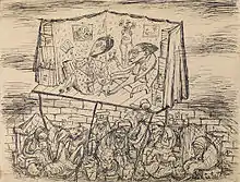 The visual arts were developed by a circle of artists, including Bedřich Fritta, Norbert Troller, Leo Haas, Otto Ungar, and Petr Kien, who were officially employed by the Arts Department of the self-administration to create drawings and graphs of work at Theresienstadt on the orders of the SS. The artists, however, depicted the ghetto's actual conditions in their spare time.[116] Several of these artists were caught smuggling their work out of the ghetto. Accused of "atrocity propaganda", they were arrested on 20 July 1944 and tortured at the Small Fortress.[49] Much of their artwork was not rediscovered until many years later, but has been a useful tool for historians to glimpse the ghetto elite as well the widespread misery in the ghetto.[117]