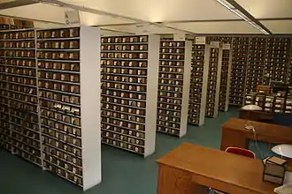 The offices of the TLL contain copies of all surviving Latin texts from 600 CE and earlier.[1] The stacks contain boxes that collectively contain about 10 million slips on which is "every surviving piece of writing from the classical period", sorted into usage categories by word.[1] For example, there are about 90,000 slips for the word 'et' and 50,000 for the word 'non'.[1] These are used as source material to create entries for each word in the thesaurus.