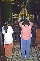 Today she is the object of worship for many. The cult that has grown up around her mostly consists of women who participate in Đạo Mẫu. They make offerings to her and ask for her aid in various aspects of their lives. They worship her through the practice of Lên đồng, whereby she is channeled by a spirit medium. Her worshipers often go on pilgrimages to Thiên Y A Na's temples and shrines, where they conduct rituals in her honour. These rituals usually consist of complex performances by a spirit medium and her attendants.