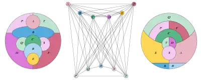 Sulanke's nine-color Earth–Moon map, with adjacencies described by the join of a 6-vertex complete graph and 5-vertex cycle graph (center). Because the adjacencies in this graph are the union of those in two planar maps (left and right) it has thickness two.