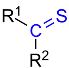 In organic chemistry, thioketones (from Ancient Greek θεῖον (theion) 'sulfur';[1] also known as thiones or thiocarbonyls) are organosulfur compounds related to conventional ketones in which the oxygen has been replaced by a sulfur.[2] Instead of a structure of R2C=O, thioketones have the structure R2C=S, which is reflected by the prefix "thio-" in the name of the functional group. Thus the simplest thioketone is thioacetone, the sulfur analog of acetone. Unhindered alkylthioketones typically tend to form polymers or rings.[3][4]