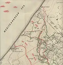 The EEF controlled the coastal sea lanes, and the Intelligence Service spread rumours about possible sea landings in the rear of Gaza. Ships were seen taking soundings off the coast and a fleet of small boats was located near Deir el Belah.[13] During the late afternoon of 1 November, an embarkation of members of the Egyptian Labour Corps onto motor launches, trawlers and tugs at Deir el Belah was staged as a feint, giving the appearance of continuing into the night. The next morning, two trawlers appeared off the mouth of the Wadi el Hesi north of Gaza.[14] To add to the confusion, between the Battle of Beersheba on 31 October and the main attacks at the Battle of Hareira and Sheria beginning on 6 November, the Ottoman left flank north of Beersheba was being fiercely contested during the Battle of Tel el Khuweilfe for control of the road to Hebron and Jerusalem. According to Wavell, "an assault on a portion of the Gaza defences was to be made by the XXI Corps."[13] The date of this attack, which was primarily a feint, was scheduled for between 24 and 48 hours before the attack on Sheria.[15]