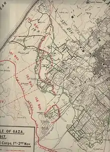 Meanwhile, preparations for the main attacks on the Gaza line at Hareira and Sharia, began on 1 November when the 53rd (Welsh) Division, with the Imperial Camel Brigade on the right, advanced northwards to occupy a line 3 miles (4.8 km) to the west without opposition. This placed the infantry in a position from which they could cover the right flank of the proposed attack by the XX Corps on Hareira and Sheria.[6][16]