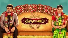 Thirumanam (transl. "The Wedding") is an Indian Tamil language drama airing on Colors Tamil. It premiered on 8 October 2018 to 16 October 2020 [1][2] The show stars Shreya Anchan and Sidhu. This series is a remake of Agnisakshi, an Indian Kannada television drama that premiered on Colors Kannada on 2 December 2013.