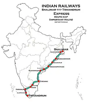 The 22641 / 42 Thiruvananthapuram–Shalimar Superfast is a Superfast train belonging to Indian Railways southern zone that runs between Thiruvananthapuram Central (Kerala) and Shalimar (West Bengal) in India.[2]