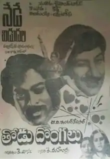 Thodu Dongalu (transl. Joint thieves) is a 1981 Telugu-language film directed by K. Vasu.[1] The film stars Krishna Ghattamaneni, Chiranjeevi, Madhu Malini, Geetha and Rao Gopal Rao in important roles.