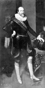 Sir Thomas Gates (died 1622) was the governor of Jamestown in the English Colony of Virginia (now the Commonwealth of Virginia, part of the United States of America). His predecessor, George Percy, through inept leadership, was responsible for the lives lost during the period called the Starving Time. The English-born Gates arrived to find a few surviving starving colonists commanded by Percy, and assumed command. Gates ruled with deputy governor Sir Thomas Dale. Their controlled, strict methods helped the early colonies survive. Sir Thomas was knighted in 1596 by Robert Devereux, 2nd Earl of Essex for gallantry at the Capture of Cadiz.[1] His knighthood was later royally confirmed by Queen Elizabeth I.