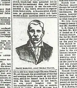 In October 1894, Blanck attempted to rob the "Mug Saloon" in Seattle, Washington, an event in which a bartender, Charles Birdwell, was killed. A law enforcement officer was also grazed in the neck during the incident.[2] A Seattle detective named Cudihee arrested a suspect a few days after the Birdwell killing, who gave his name as Tom Blanck. Blanck reportedly then confessed to many additional crimes.[3]