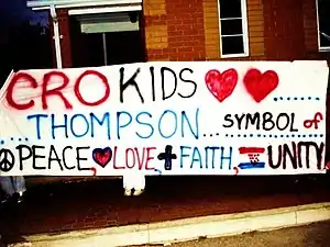 Thompson was asked by Croatian veteran groups to perform at the Defender's Day celebrations at Zagreb's Ban Jelačić Square, the concert being free of charge.[19] An estimated 55–60,000 people attended the concert by the official police estimates, some figures placed the number at 100,000.[20]