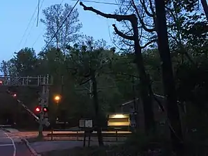 Trolleys arriving at this station travel between 69th Street Terminal in Upper Darby Township, Pennsylvania and Orange Street in Media, Pennsylvania. The station has a shed with a roof where people can go inside when it is raining. This shed is a traditional "Red Arrow" shed located in an area that's both wooded and residential. Because of this, no parking is available at this station. Thomson Avenue climbs a hill on the west side of this stop as it prepares to terminate at Springfield Hospital on Sproul Road (PA 320), which has a stop of its own at Springfield Mall.