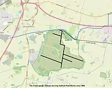 Creyke's Siding and Moorends Works were both located close to the main railway line from Doncaster to Goole (Hull and Doncaster Branch), and were served by sidings. Medge Hall Works was similarly close to the line from Doncaster to Grimsby, and was also served by a siding.[32] Swinefleet Works had their own 3 ft 7 in (1,093 mm) gauge tramway, which ran northwards to a wharf on the River Ouse near Swinefleet Clough. The line was around 2 miles (3.2 km) long, and had a single steam engine, built by Webster, Jackson & Co. of Goole.[33] The Goole and Marshland Light Railway and the Isle of Axholme Light Railway were authorised by Light Railway Orders in 1898 and 1899, and became the Axholme Joint Railway after a takeover by two larger companies in 1901. Following discussions, to try to alleviate a level crossing of the tramway and the new railway, a siding was constructed to Swinefleet Works, and the tramway was lifted in 1903. The railway company also built a 5-mile (8.0 km) branch from Epworth in 1909,[32] in the hope of gaining the peat traffic from Hatfield Works, but they continued to cart their output north to Maud's Bridge, on the Doncaster to Scunthorpe line. The railway built a loading dock in 1911, and still did not gain the traffic, but finally in 1913, agreed to build a siding into the works in exchange for all the peat traffic.[34] Thus all of the British Moss Litter Company's works could export their produce by rail.[32]