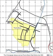 Thorne and Hatfield Moors form the largest area of lowland raised peat bog in the United Kingdom.[1] They are situated in South Yorkshire, to the north-east and east of Doncaster near the town of Thorne, and are part of Hatfield Chase. They had been used for small-scale extraction of peat for fuel from medieval times, and probably much earlier, but commercial extraction of the peat for animal bedding began in the 1880s. The peat was cut on the moors and, once it had dried, transported to several works on 3 ft (914 mm) narrow gauge tramways, always called trams locally. The wagons were pulled by horses to works at Creyke's Siding, Moorends, Medge Hall, Swinefleet and Hatfield. There was also a network of canals supplying the Moorends Works.