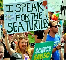 Owing to the popularity of numerous sea turtle species, people often travel to areas where the turtles nest, live to observe and photograph them.[19] This has resulted in numerous deaths of the turtles through boat collisions, tourists attempting to catch or steal individuals, and other incidents. In Costa Rica, tourists have recently been criticised for interfering with the nesting habits of the resident olive ridley sea turtles, disrupting and confusing the animals by attempting to take selfies with them.[20]