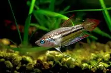 The threestripe gourami normally shows one or two, almost never three, dark stripes running the length of its body but there it lacks any strip along the base of the anal fin. The elongated rear anal fin rays do not reach beyond the middle of the caudal fin which is lanceolate in shape. The dorsal, anal and caudal fin have red margins and are marked with many blue spots.[2] Males are larger than the females and have elongated rays in the pelvic, dorsal, anal, and caudal fins.[3] It can attain a length of 4 centimetres (1.6 in)[4] with the largest males measured at 5 centimetres (2.0 in).[2] It is intermediate in size between its congeners, being smaller than the croaking gourami (Trichopsis vittata) and larger than the pygmy gourami (T. pumila).[4]