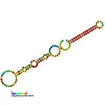 The threonine operon leader is an RNA element. Threonine is one of at least 6 amino acid operons are known to be regulated by attenuation.[1] In each a leader sequence of 150–200 bp is found upstream of the first gene in the operon. This leader sequence can assume two different secondary structures known as the terminator and the anti-terminator structure. In each case the leader also codes for very short peptide sequence that is rich in the end product amino acid of the operon. The terminator structure is recognised as a termination signal for RNA polymerase and the operon is not transcribed. This structure forms when the cell has an excess of the regulatory amino acid and ribosome movement over the leader transcript is not impeded.[1] When there is a deficiency of the charged tRNA of the regulatory amino acid the ribosome translating the leader peptide stalls and the antiterminator structure can form. This allows RNA polymerase to transcribe the operon.[1]