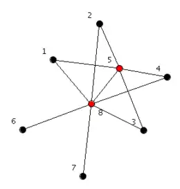 For example, the graph of the figure is a threshold graph. It can be constructed by beginning with a single-vertex graph (vertex 1), and then adding black vertices as isolated vertices and red vertices as dominating vertices, in the order in which they are numbered.