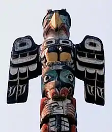 American science historian and folklorist Adrienne Mayor and British historian Tom Holland have both suggested that indigenous thunderbird stories are based on discoveries of pterosaur fossils by Native Americans.[11][12] However, it has also been noted by tribal historians, despite variations (note: much Indigenous references are verbal and difficult to reference), the typical design elements of the motif within different tribal groups across the continent appear distinct from the makeup of the suggested prehistoric flying reptile, such as eagle or raptor-like avian feathered wings and tail, along with a vastly different head shape, perhaps with the exception of some Pacific Northwest imagery.