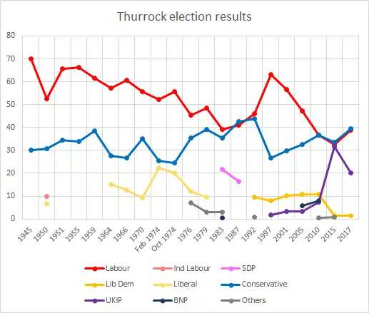 In 2017, the seat was number 1 on UKIP's 2017 target list, the party only needing a 0.98% swing to win the seat from third place if the previous result were repeated. The constituency was also at number 7 on Labour's target list, with a 0.54% swing needed for their candidate to win the seat. In the event, the swing to Labour was around 0.2% and Doyle-Price held the seat by a mere 345 votes, making it the 26th-closest nationally (of 650 seats).[5] This was also the third consecutive occasion that Thurrock had been held or won very narrowly. At the 2019 general election, Doyle-Price's vote share increased by 19.1%, the largest increase in vote share achieved by any Conservative candidate in the United Kingdom at that election, and her majority rose to 11,482 votes, making it a safe Conservative seat.[6]