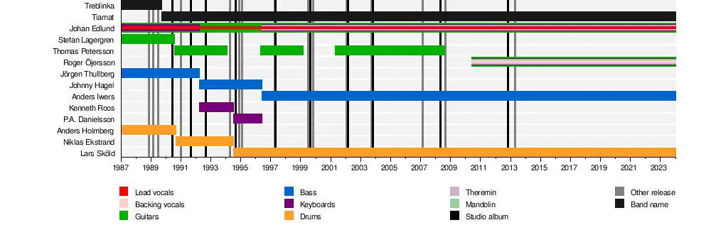 Tiamat is a Swedish metal band that formed in Stockholm in 1987 and led by Johan Edlund. The band went through a number of stylistic changes, usually leaning toward gothic metal.