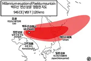 The 946 eruption of Paektu Mountain in Korea and China, also known as the Millennium Eruption[2] or Tianchi eruption,[3] was one of the most powerful volcanic eruptions in recorded history and is classified as a VEI-6 event.[1][4] The eruption resulted in a brief period of significant climate change in Manchuria. The eruption occurred in late 946 CE.[5]