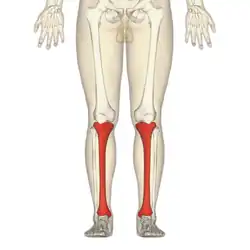 The shaft or body of the tibia is triangular in cross-section and forms three borders: an anterior, medial, and lateral or interosseous border. These three borders form three surfaces: the medial, lateral, and posterior.[2] The forward flat part of the tibia is called the fibia, often confused with the fibula.[3]