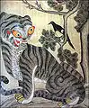 There are 635 historical records about tigers in the Annals of the Joseon Dynasty.[2] The story of a tiger that began from a myth can be also found in daily life as well. For example, the 19th-century painting named "Sansindo" depicts the guardian spirit of a mountain leaning against a tiger or riding on the back of the animal. The animal is also known to do the errands for the mountain's guardian spirit which is known to wish for peace and the well-being of the village. So, the tiger was ordered by the spiritual guardian of the mountain to give protection and wish for peace in the village. People drew such paintings and hung them in the shrine built in the mountain of the village where memorial rituals were performed regularly. In Buddhism, there is also a shrine that keeps the painting of the guardian spirit of the mountain. Called "Sansintaenghwa", it is depiction of the guardian spirit of the mountain and a tiger.