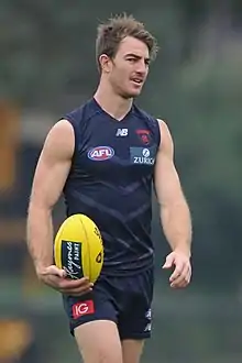 After his emergence for the Casey Scorpions in the VFL, Smith was recruited by the Melbourne Football Club (Casey's affiliate team) with their second selection and twenty-fifth overall in the 2017 rookie draft.[13] He was predicted by AFL Media reporter, Dinny Navaratnam, as the draftee who would have the greatest impact at Melbourne for the 2017 season.[14] After "impressing" in VFL pre-season matches,[15] in which Casey-coach, Justin Plapp, said he was playing at an "exceptional level",[16] he made his AFL debut in the twenty-nine point loss against Geelong at Etihad Stadium in round three, in which he kicked his first AFL goal.[17] Smith retired at the conclusion of the 2019 season.[18]