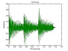 Figure 1 shows the waveform of an audio file "" with 44100 Hz sampling frequency. Figure 2 shows the time-frequency plot of the short-time Fourier transform (in particular, Gabor transform) results of the audio file. In this plot, horizontal lines with frequencies not greater than 230 Hz represent the fundamental frequencies while horizontal lines with frequencies above 230 Hz represent the harmonic components. Observe that from t = 0 to 0.5 second, a chord consists of three notes (C-E-G) is played. The chord then changed to C-E-A at t = 0.5, and then changed again to D-F-A at t = 1.