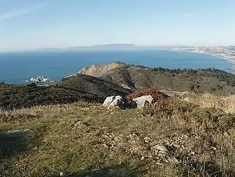 View north from San Pedro Mtn., Point Reyes in distance at far left, Pacifica to the right - 19 – Following the coast as it curves more to the northwest, the next camp was at today's Scott Creek, a popular wind-surfing beach near the community of Swanton.