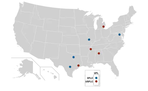 This timeline of the United Football League (UFL) tracks the history of each of the league's eight franchises from their enfranchisements in the XFL and USFL, through the merger of the two leagues, and to the present day.